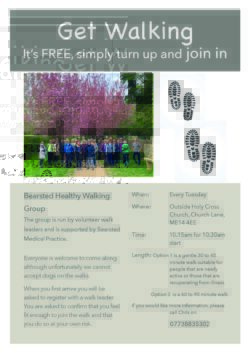Bearsted Healthy Walking Group meets every Tuesday at Holy Cross Church at 1015 for a 1030 start. We offer a short walk around 45 minute and a longer one, around 75 to 90 minutes. Everyone is welcome although unfortunately we do not accept dogs on the walks. Just turn up or if you need further information ring Chris on 07738835302. b.patientparticipation@nhs.net