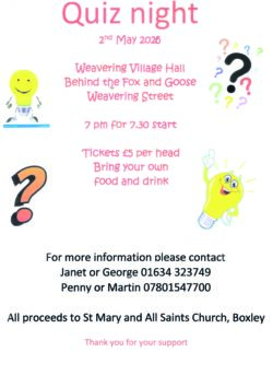 Join the Friends os St Mary’s and All Saints Church, Boxley for a Quiz Night at Weavering Village Hall (Behind the Fox and Goose Weavering Street) 7pm for 7.30pm start. Tickets £5 per head. Bring your own Food and Drink for more information please contact Janet or George 01634 323749, Penny or Martin on 07801547700. All proceeds to St Mary’s and All Saints Church, Boxley